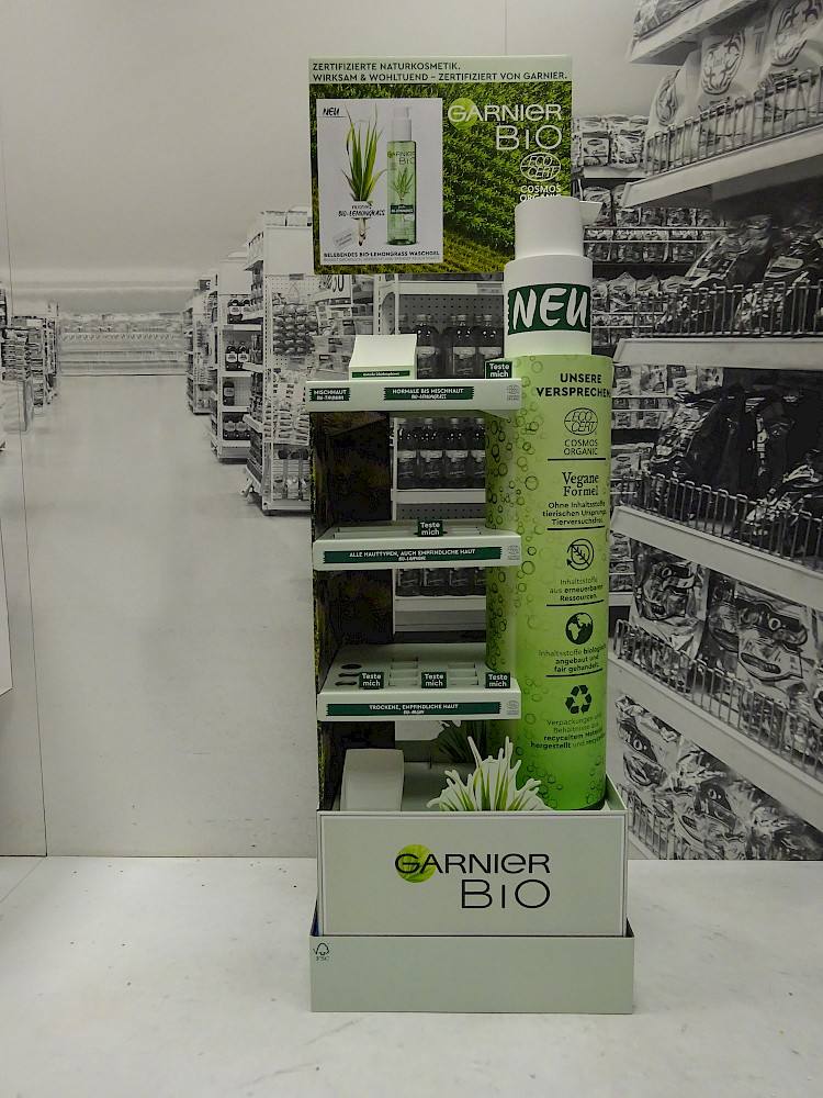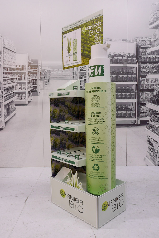 Specjalnym elementem przyciągającym wzrok jest ponadwymiarowa replika opakowania produktu. To nie tylko zwraca uwagę klienta na produkty, ale także oferuje wystarczającą przestrzeń do komunikacji. Na tej powierzchni przekazywane są ekologiczne zalety kosmetyków. Drugi język motywów również stawia naturę na pierwszym planie. Na tylnej ścianie gdzie zamonowane są trzy półki znajduje się motyw roślinny, podobnie jak na topperze. Ekspozytory te są używane głównie w drogeriach.