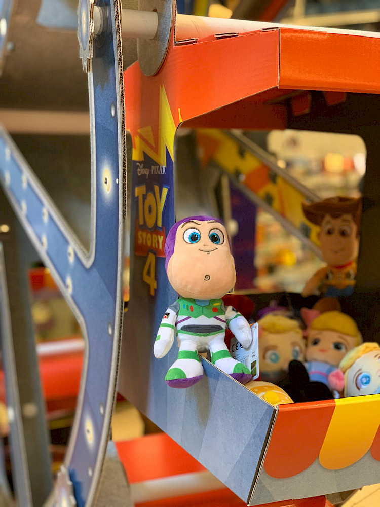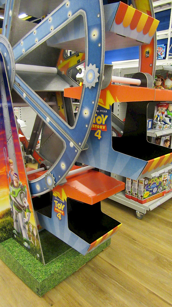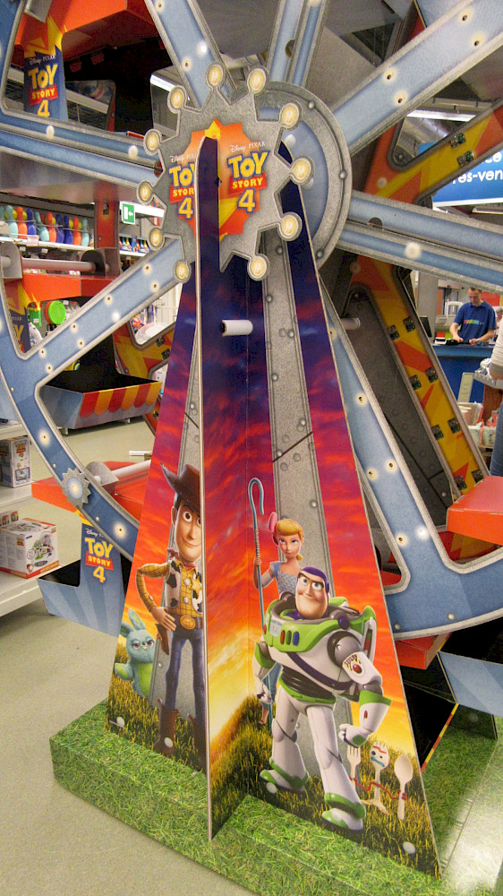 Zabawki do filmu animowanego Toy Story 4 są prezentowane w gondolach diabelskiego młyna. Poprzez przesunięcie koła, produkty są dodatkowo inscenizowane. Dzięki fotobudce w kształcie opakowania zabawki, w którym dzieci mogą pozować jako jeden z głównych bohaterów filmu Toy Story 4, osiągasz czynnik zabawy. Ekspozytor wykonany jest głównie z tektury falistej i drukowany cyfrowo.